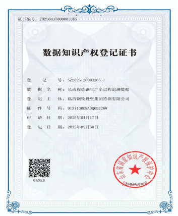 近日,临沂钢铁投资集团特钢有限公司(以下简称“特钢公司”)成功取得由山东省数据知识产权登记平台核发的“长流程炼钢生产全过程追溯数据”知识产权证书,成为山东省内首家进行数据知识产权登记的钢铁企业。这一标志性事件不仅展现了特钢公司在技术创新和数据治理领域的领先地位,也为整个行业在数字化转型过程中提供了重要参考。